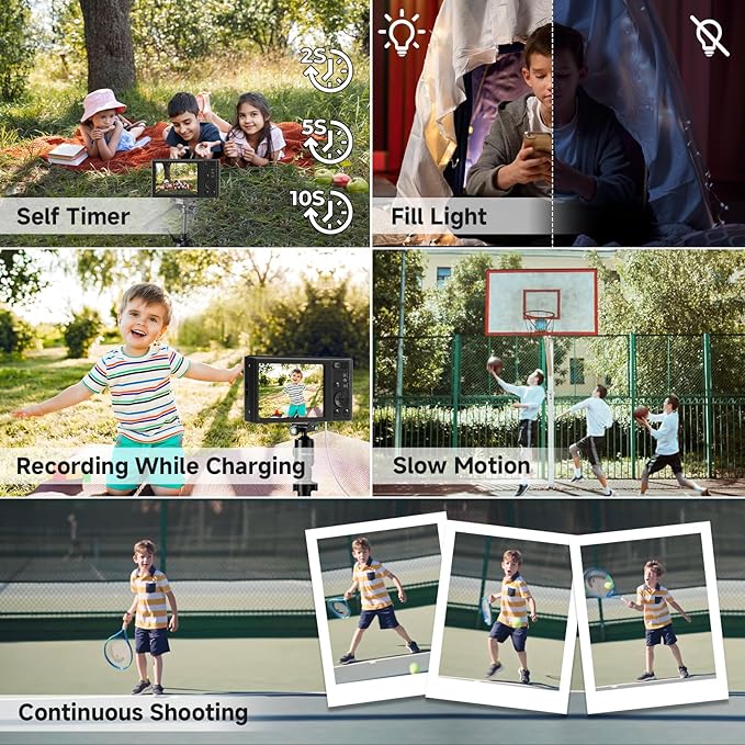 - 【16X Digital Zoom & Multifunctional】This digital camera for teens features a 16X digital zoom, easily adjustable with the W/T button. Simply press the shutter halfway for sharp, vivid images, and use the zoom to reach distant landscapes. Our digital camera built in 3 flash bulbs make the illumination brighter, helping you take clear photos even in low light. It also features self-timer, continuous shooting, fill light, time-lapse, slow motion, filters, date stamp, and scene modes, making it versatile for indoor and outdoor use.