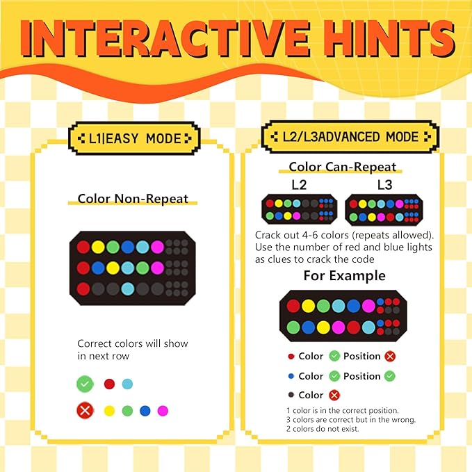 - TWO PLAYERS MODE:Take turns setting secret codes to challenge family or friends.Enhance family bonding time while breaking codes