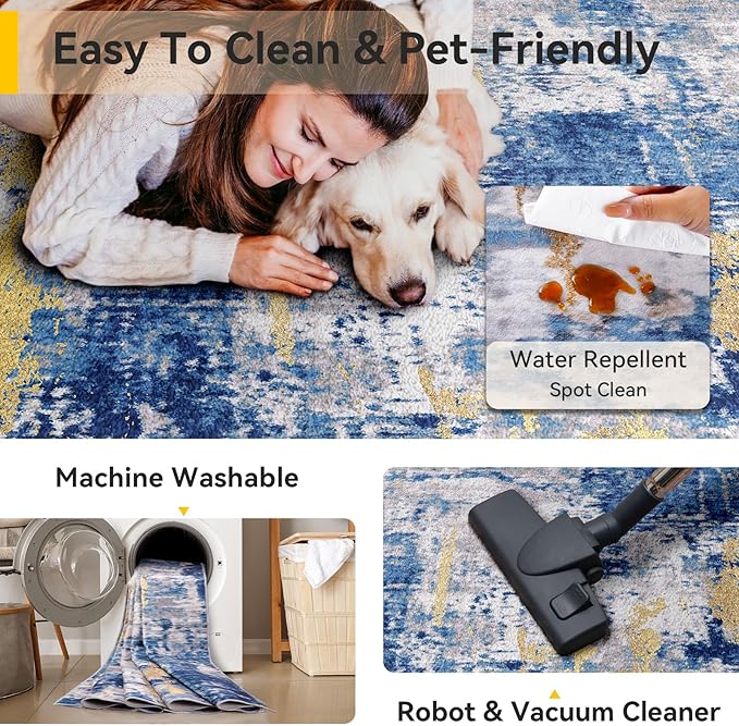 - Tides Series – Effortless style that flows with your life.This modern machine-washable non-slip rug features reinforced edges and a low-pile design that resists dirt. Its water-repellent surface makes spills easy to clean - liquids bead up for quick wiping. Simply machine wash in cold water (no bleach) to refresh. The non-slip backing keeps it securely in place. A perfect blend of function and contemporary design for active homes.