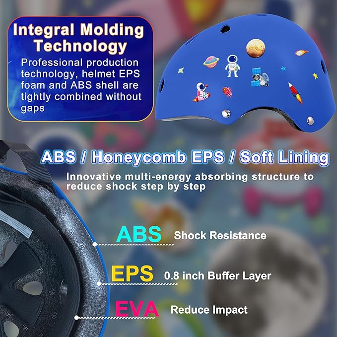 - 【Unique DIY Kids Helmet】 Toddler youth helmet included space themed stickers, your kids can enjoy and use their imagination to create their own customized bicycle helmet. With knee pads and elbow pads set, effectively protects your kids from injuries during multi-sports, not only protects the baby but also delights the mood. The designed bicycle helmet is a great gift for kids 8-14 years old. (One sticker picture will be given randomly)