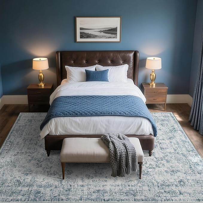 Light Blue 6x9 Area Rug Machine Washable for Living Room, Distressed Non Slip Rugs for Bedroom, Traditional Indoor Retro Floral Accent Vintage Carpet for Office Dining Room, Dorm