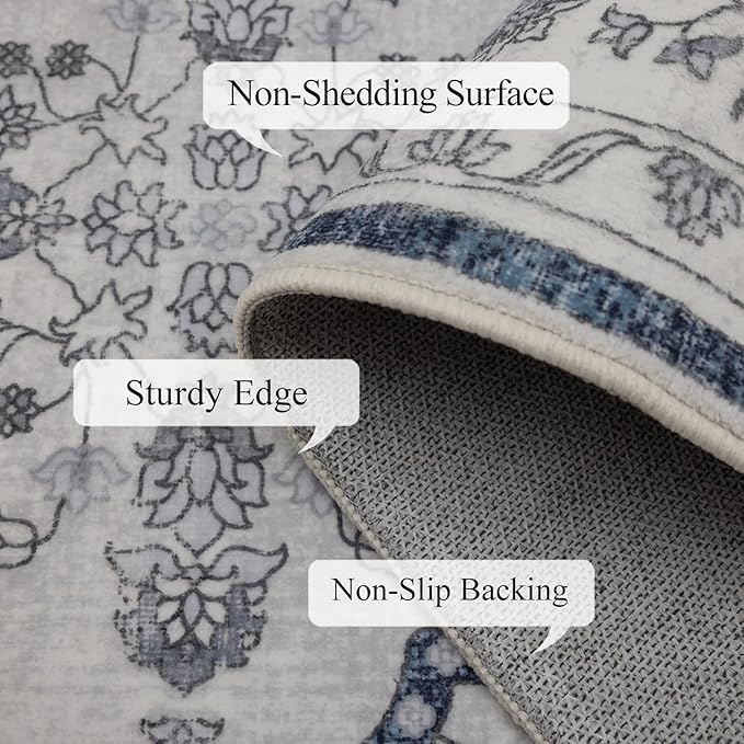 Washable Rugs 5x7 Area Rugs for Living Room, Thin Carpet for Bedroom, Soft Faux Wool Retro Dining Room Rug,Non Slip&Non-Shedding Resistant Low Pile Vintage Print Rug for Home Office (Grey/Blue)