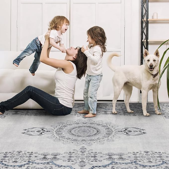 Washable Area Rugs 8x10, Large Rugs for Living Room, Carpet for Bedroom, Soft Faux Wool Retro Dining Room Rug, Non-Slip Backing Resistant Low Pile Vintage Print Rug for Home Office (Grey/Blue)