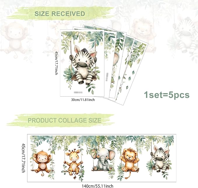 - 【What You’ll Get】 – Each set includes 5 good-quality vinyl sheets measuring(17.71" x 11.81"). This set of cute animal stickers includes 5 playful animals swinging on a green vine. Made of durable, waterproof, vinyl, these decals are safe for children and built to last.