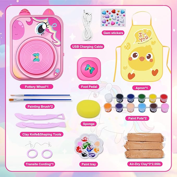 - UNICORN POTTERY WHEEL TOY FOR KIDS: Our Pottery Wheel Toy has complete pottery art supplies with a mini pottery studio, sculpting tools toys, 3 packs air dried clay, 12 colors, 2 brushes, sponge, palette and apron. Everything you need to shape, and color your clay into stunning works of art is conveniently included in this kit.