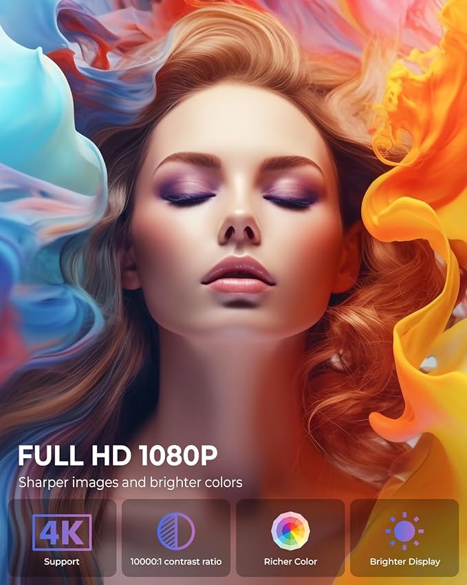 - Latest Upgraded Smart Mini Projector: The Mini projector is equipped with advanced LCD screen technology, Supports Full HD 1080P and 4K resolution, can vividly reproduce the details and colors of the image; good brightness of 10000 lumens, and a contrast of 10000:1.The excellent 1.29:1 projection ratio allows you to get a larger screen size even in a small space. Smart Projector liberates your hands, bringing you a more convenient and comfortable projection experience.