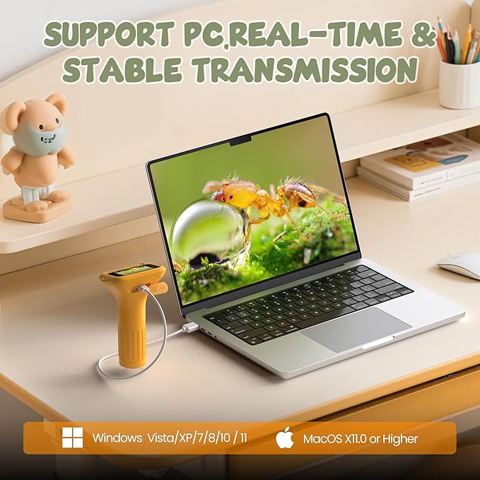 - Portable & Long-Lasting, Wide Application: As a compact handheld microscope, it’s easy to carry for outdoor trips, with a 2-hour battery life that lasts through park visits or backyard explorations. Whether observing soil microbes or flower stamens, this portable tool turns any spot into a science lab. Unlike bulky models, this microscope fits in a backpack, making it perfect for on-the-go curiosity
