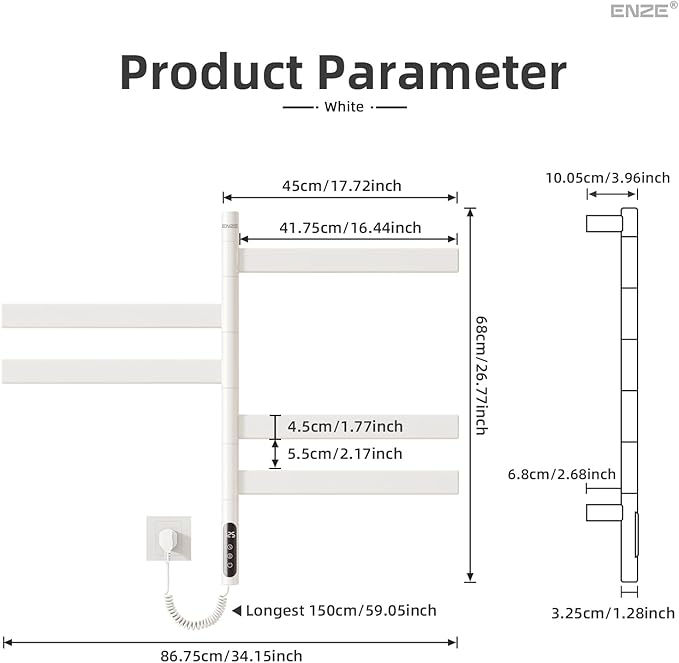• 【LED Touch Panel with Adjustable Timer & Temperature】 Set the perfect warmth using the heating towel rack’s LED touch screen. Adjustable timer (1–24 hours) and temperature control (115–150℉) keep towels cozy. Use the constant 115℉ mode for all-day warmth on your heated towel bars for bathrooms.