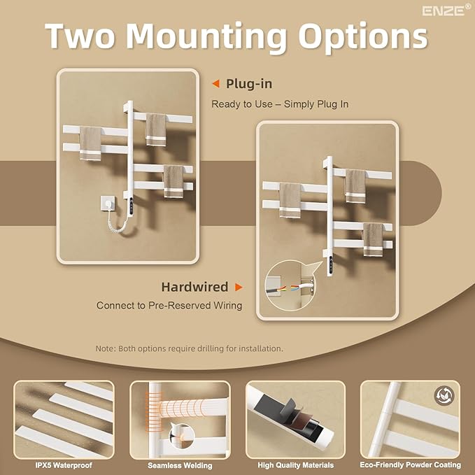 • 【Flexible Installation: Hardwired or Plug-In】 Designed as a hardwired towel warmer or plug-in unit, install this wall-mounted heated towel rack with included hardware and instructions. Great as a towel heater rack or electric towel drying rack for any bathroom setup.
