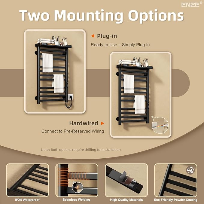 - 【Flexible Installation: Plug-in/Hardwired】 Whether you're retrofitting or renovating, this unit supports both plug-in towel warmer bars and hardwired towel warmer installations. Made of eco-coated low carbon steel, it’s a durable heated towel rack for bathroom, ideal as a wall-mounted heated towel rack or towel bar warmer for bathroom.