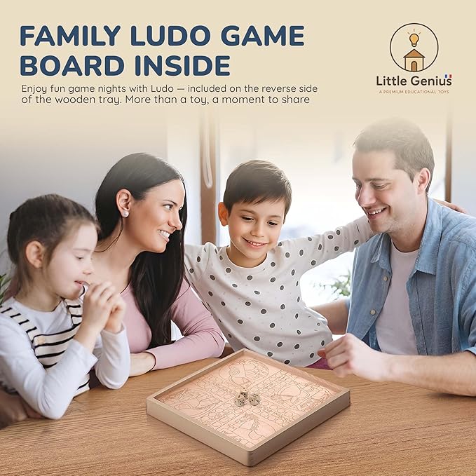 - 2-in-1 Wooden Tray with Board Game – Flip the sliding lid to reveal a classic Ludo board; build first, then enjoy family game time.