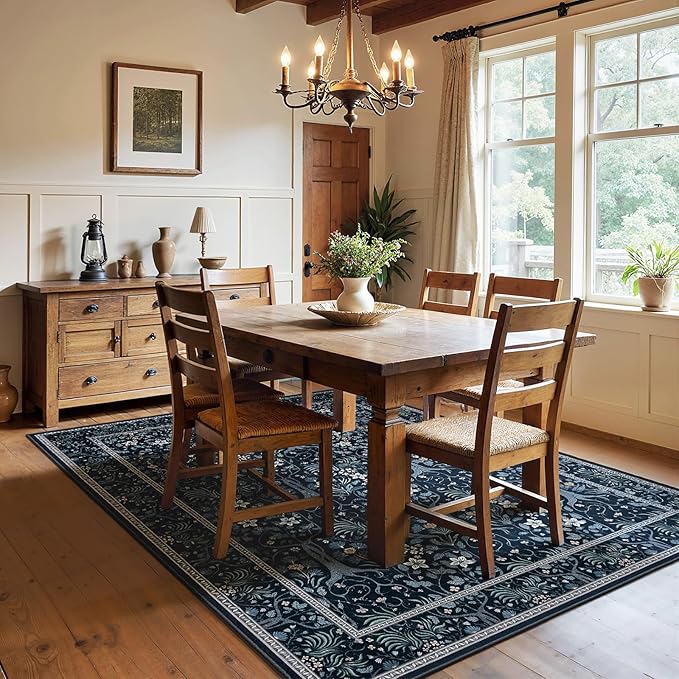 Joydeco Machine Washable Area Rugs 5x7, Boho Floral Rug for Bedroom Non Slip, Soft Forest Botanical Low-Pile Floor Indoor Throw Carpet for Living Dining Room Dorm Office, Blue-Black