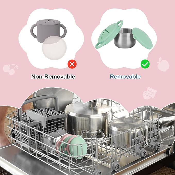 - Easy to Clean: Say goodbye to sticky residue and odors! Our baby snack cups feature a unique 3-in-1 detachable design that can be opened with a simple twist, making deep cleaning easy and simple. It is stain-resistant and dishwasher-safe, or can be quickly wiped clean. This makes cleaning a breeze for busy parents, allowing children to be ready to enjoy any snack time adventure.