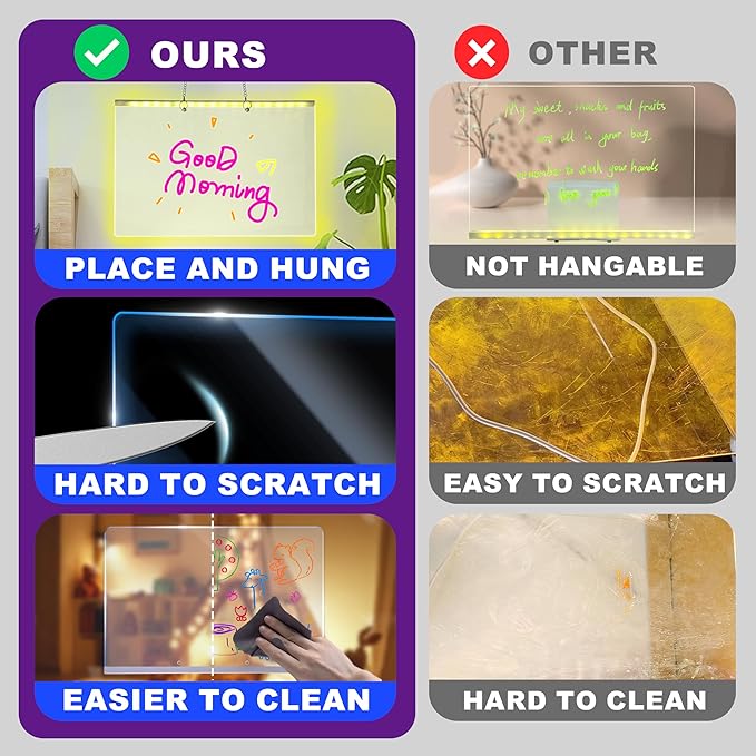 - Durable Build and Ideal Size: Crafted with acrylic material, this LED note board is made of premium water-soluble material, it stands up to frequent wiping and daily use without scuffs. At 11.9"X8", it provides plenty of space for creativity– ample room for kids’ drawings, family reminders, or brainstorming sketches. Sturdy yet lightweight, it balances durability with easy handling for all ages.