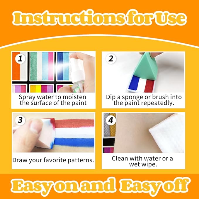 - 💦Hypoallergenic Face Paint for Kids: Made with water-based, non-toxic ingredients, Our cosmetic grade face paint is hypoallergenic 100% paraben-free and compliant with strict FDA safety standards—perfect for worry-free use at family events, school activities, or daily play.