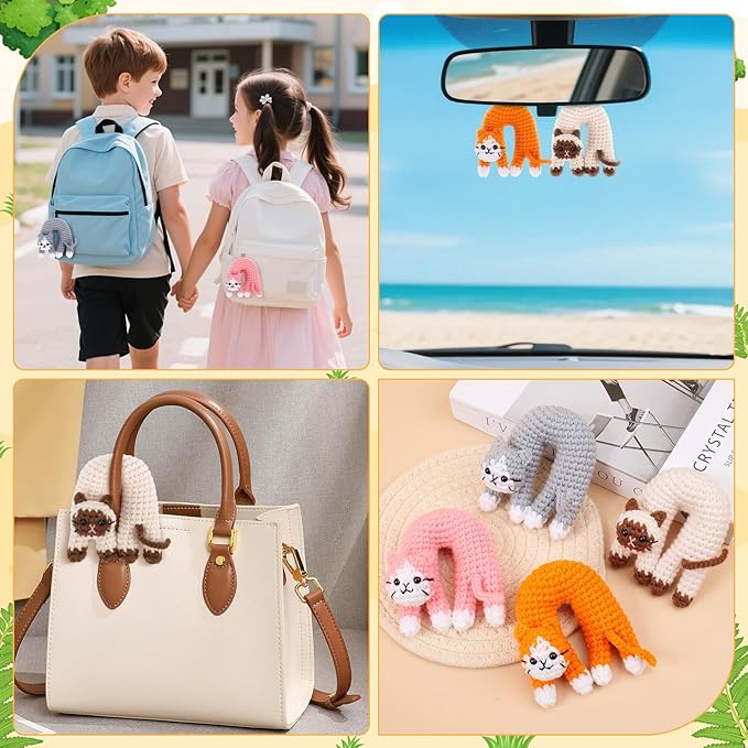 - Create 4 Arched Back Cats: Make your own set of handmade crochet cats with four different cat color patterns, including an orange tabby, a siamese, a classic grey, and a playful pink kitten. The funny finished cats are perfect as home decorations, desk buddies, adorable children's toys, car pendants, bedroom ornaments, bag charms, or key chain.Perfect for cat lovers and crochet enthusiasts.