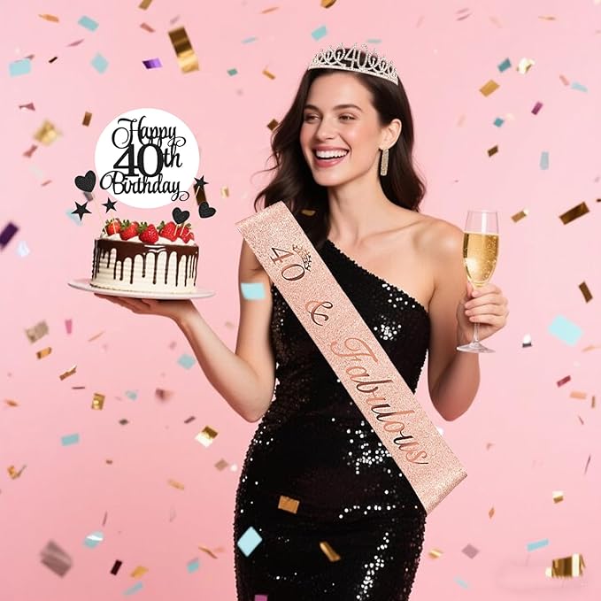 - 40th Rhinestone Crown & Sparkly Sash: The birthday sash, made of soft fabric via hot-press stamping glitter technique, features superior quality with non-shedding glitter and rose gold 40&Fabulous letters. The crown, crafted from sturdy hard alloy with dazzling rhinestones, is meticulously designed for 40th birthday parties.