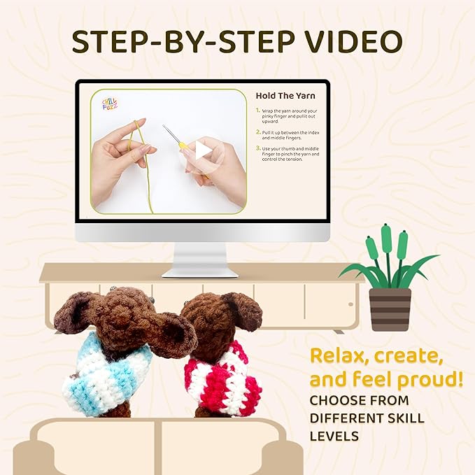 - Complete Animal Crochet Kit Everything you need in one box – each kit includes soft yarn, a crochet hook, plastic eyes, detailed step-by-step instructions, and all essential accessories to complete your own cute animal plush.