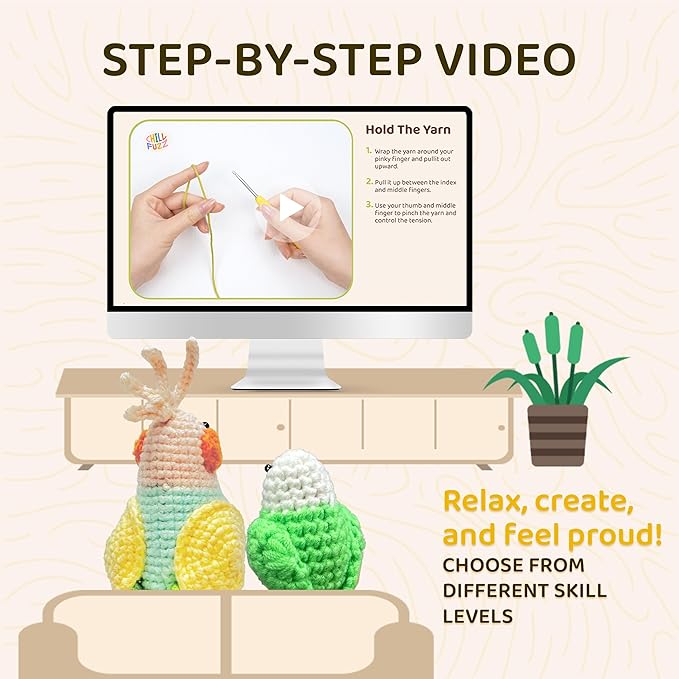 ChillFuzz Animal Crochet Kit Beginner Crochet Kit for Adults and Kids with Yarn Hook and Step by Step Instructions Relaxing DIY Gift Parrot