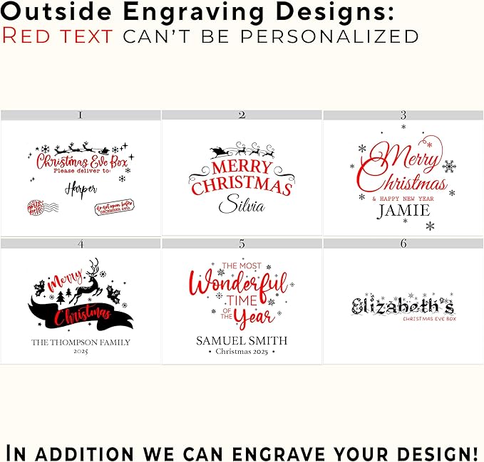 - Personalized: Kids Christmas eve box can be engraved with designs we offered adding the child's name, names, family name, year to make it unique. We’ll use the font style showcased in the photos. Additionally, it can be engraved inside, on the other lid's side, to create a surprise message for the recipient. Different font options for inside engraving.