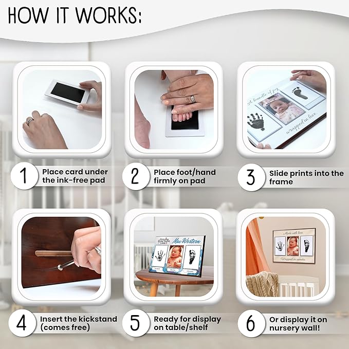 - NO HASSLE, NO MESS BABY KEEPSAKE - With lovely designs you can choose from, built-in acrylic cards to insert the prints to, a printed photo of your baby, no-mess inkpads for baby hand and footprints, this is the easiest way to capture your baby’s adorable prints forever. It comes with 4 print cards and 4 safe, no-mess ink pads, so you can try to get the perfect print more than once!
